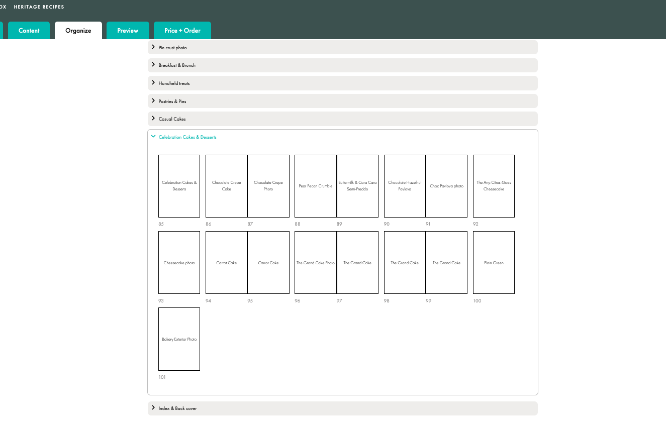You can easily rearrange recipes, text pages, or photo pages within the same section (chapter) of your book.